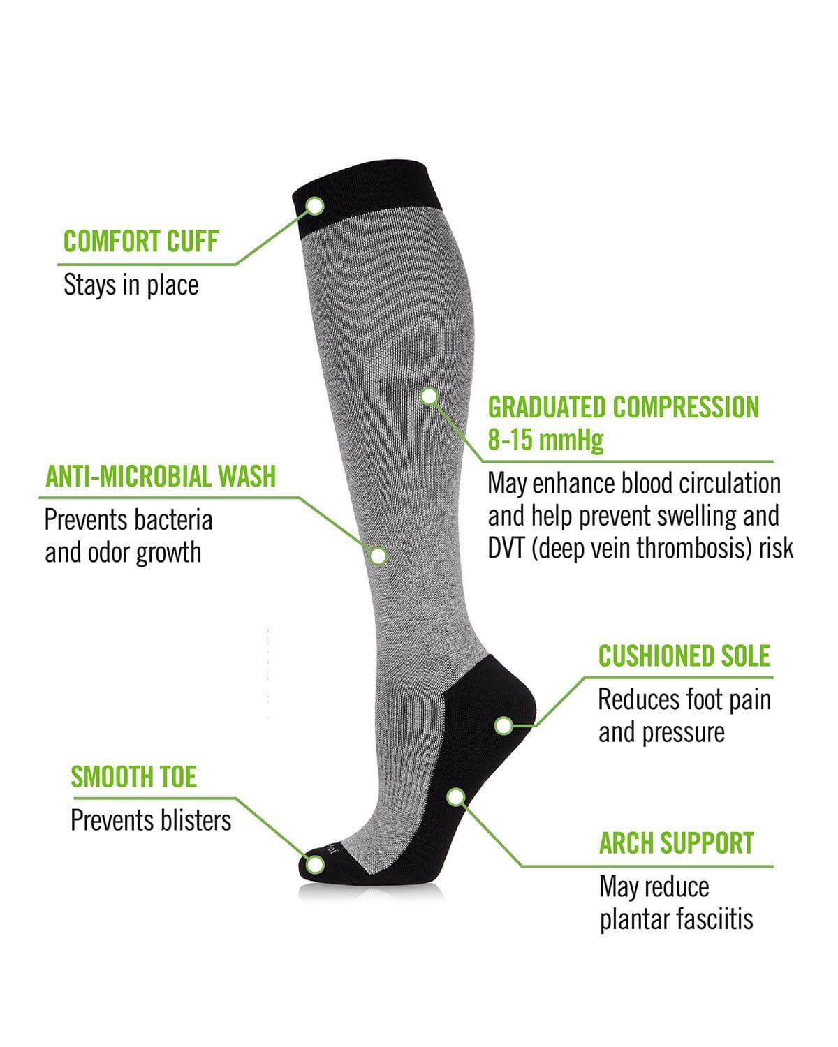Energize your step in our Two-Tone Contrast Bamboo Blend Compression Socks. Created with moderate and graduated compression, so they're not too tight, but just snug enough to give you that extra support you need. Compression socks are great for busy travelers, active athletes, and long days at the office. Featuring a comfort cuff to provide smooth support and a non-slip fit, with anti-microbial properties that fight against foot odor. The smooth and seamless toe prevents irritation, and the added cushioned sole reduces pain and pressure so you can take a load off. The stretchy knit nylon feels weightless and will keep you cool and comfortable for all day wear. Healthy blood flow and swelling reduction might not be all that glamorous, but you might as well do it in style!